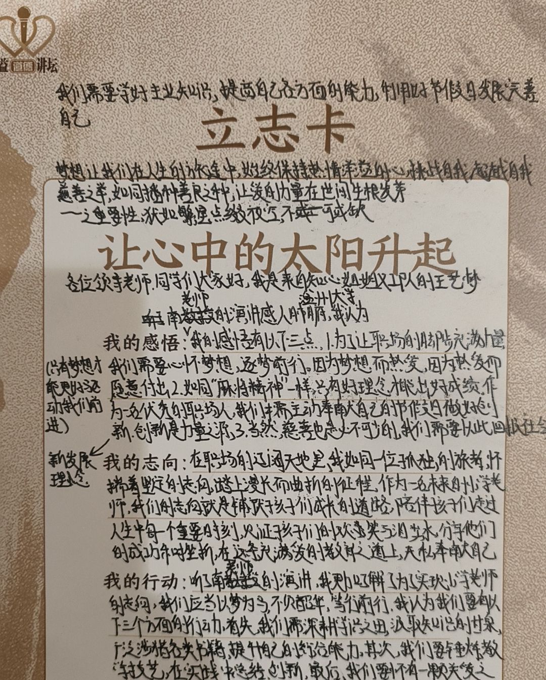“志不立,天下无可成之事。”郑雪君勉励现场的听众,要努力提升自己的心灵品质,开发心中无尽的宝藏,立鸿鹄志、做奋斗者,升起心中的太阳!