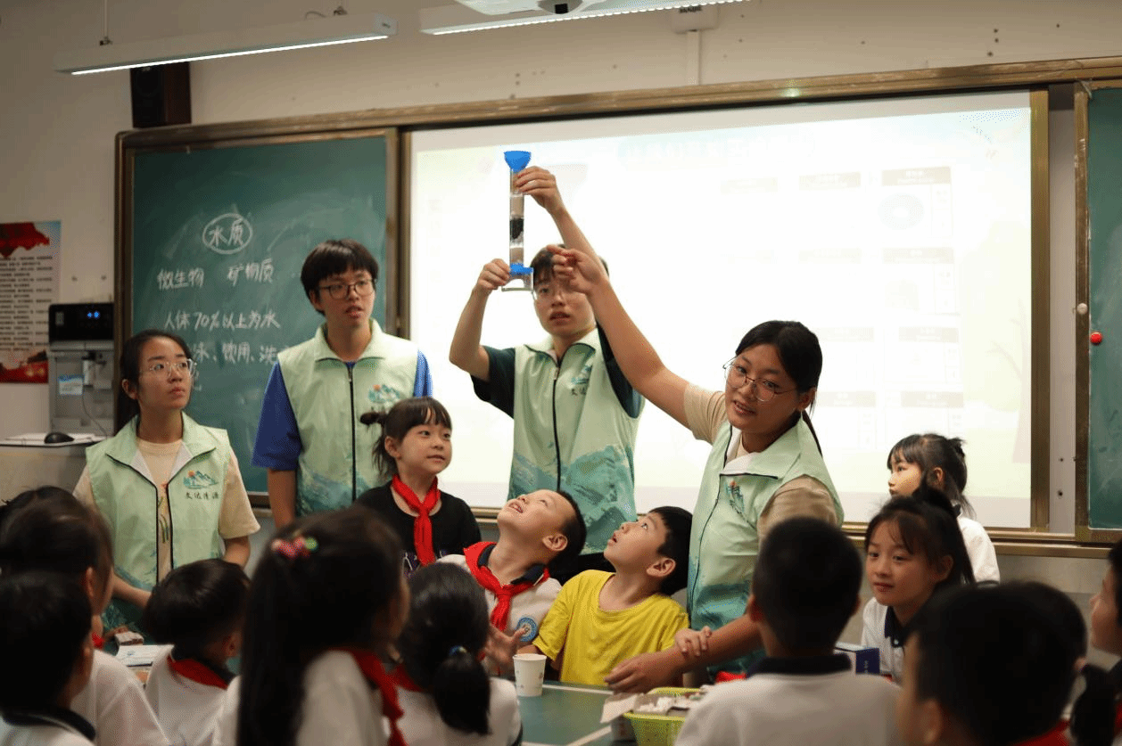 污水防治、美化环境,人人有责!为了迎接世界地球日,温大生环学院学子及“文达清源”团队来到永嘉源头村,参观村内污水处理设施、无废宣传长廊、无废生活体验馆等,了解垃圾分类、污水处理、生态农业等生态环保措施,资源与环境等专业研究生与当地村民交流环保理念和实践经验。该服务团队还在ac米兰官网中文网站附属茶山实验小学、乐清市仙溪镇第一小学等学校,以“河道保卫战”贯穿五水共治政策,配合开展净水小实验,沉浸式向孩子们传递“一点一滴,加倍珍惜”的水资源理念,让节水意识深入孩子的内心,渗入他们的生活之中,帮助小学生们扣好生态文明第一扣。
