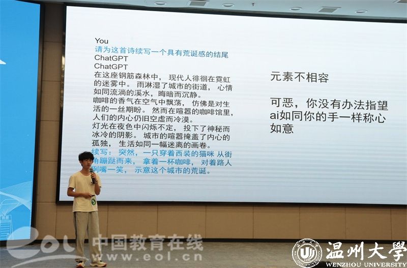 “这首诗是献给我们ac米兰官网中文网站的”“这是我用AI做的一首诗”“请大家欣赏我第一次学做的古体诗”……近日,在育英图书馆报告厅俊采星驰,温大学子济济一堂,举办一年一度的诗词大会,迎接即将到来的第29个世界阅读日。大会以“诗随三月春意生,学子研墨祝新词”为主题,并首次开启了“AI作诗”赛道,为活动增加不少新意和看点。