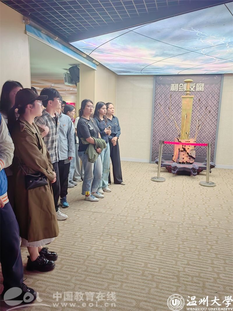 瓯海区廉政教育基地位于瓯海区行政中心二号楼五层,建筑面积500平方米。分为序厅和主展厅。在讲解员的带领下,全体毕业生党员首先参观了序厅。序厅正中有仿制的“刑鼎”,吊顶有“廉”艺术字型,地面上采用现代电子映射技术而作的“步步生莲(廉)”互动场景。序厅正前方是浮雕主题影壁墙,由多个富含“廉洁”寓意的元素构成。