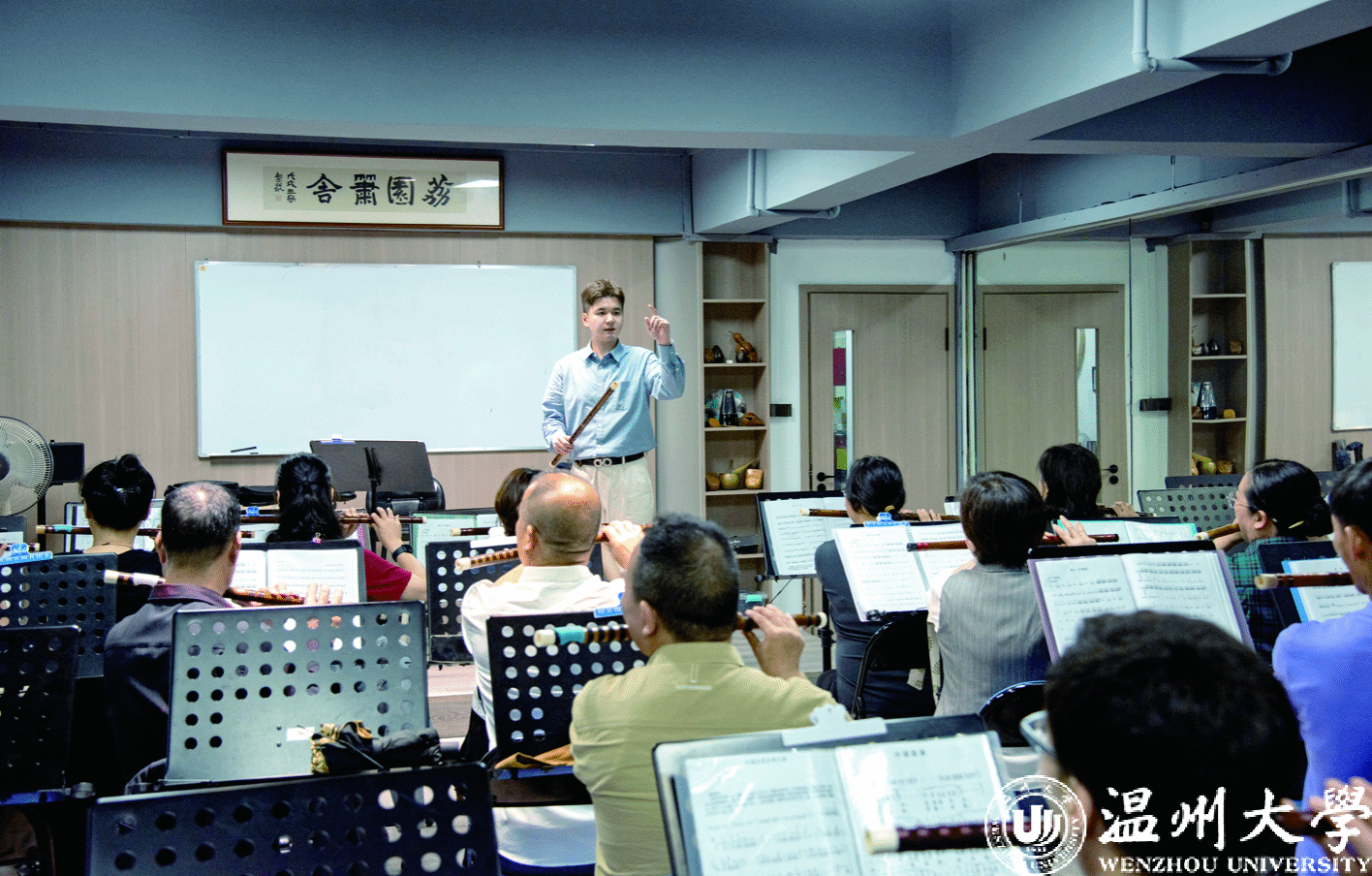 一个普通的午后,瓯海区文化馆排练大厅内坐满了学员,周昕正在声情并茂地给公益班的学员上课。当走进排练厅时,恰逢学员吹奏竹笛,悠扬的乐曲声像潺潺溪流,浸润心灵。这样的公益课周昕已经坚持上了近4年,“最开始文化馆管理人员联系我的时候,我是抱着试试看的心态来的。几年下来,我接触到了很多喜欢音乐却没机会学习的市民,感受到了他们对竹笛的热情,公益课能帮助到他们进步,我很高兴。”他说。