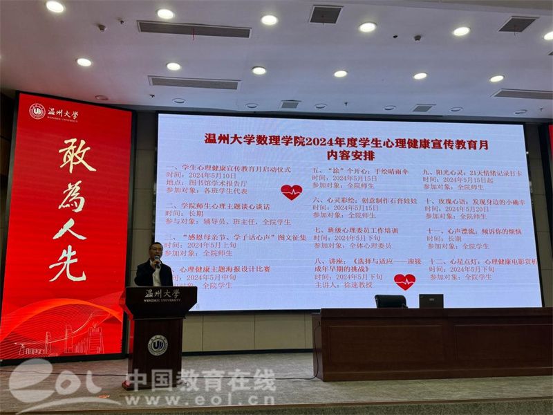 据温大数理学院相关负责人介绍,学院实施“一月一主题”的学生工作模式,在前期3月雷锋月、4月学风建设月基础上,本月开展心理健康月主题活动。活动旨在通过形式多样的宣传教育活动,营造积极关心关注、支持参与学生心理健康教育的良好校园氛围,激发青年学子对心理健康问题的关注,进而推动学生心理健康工作提质增效,促进学生身心健康发展。