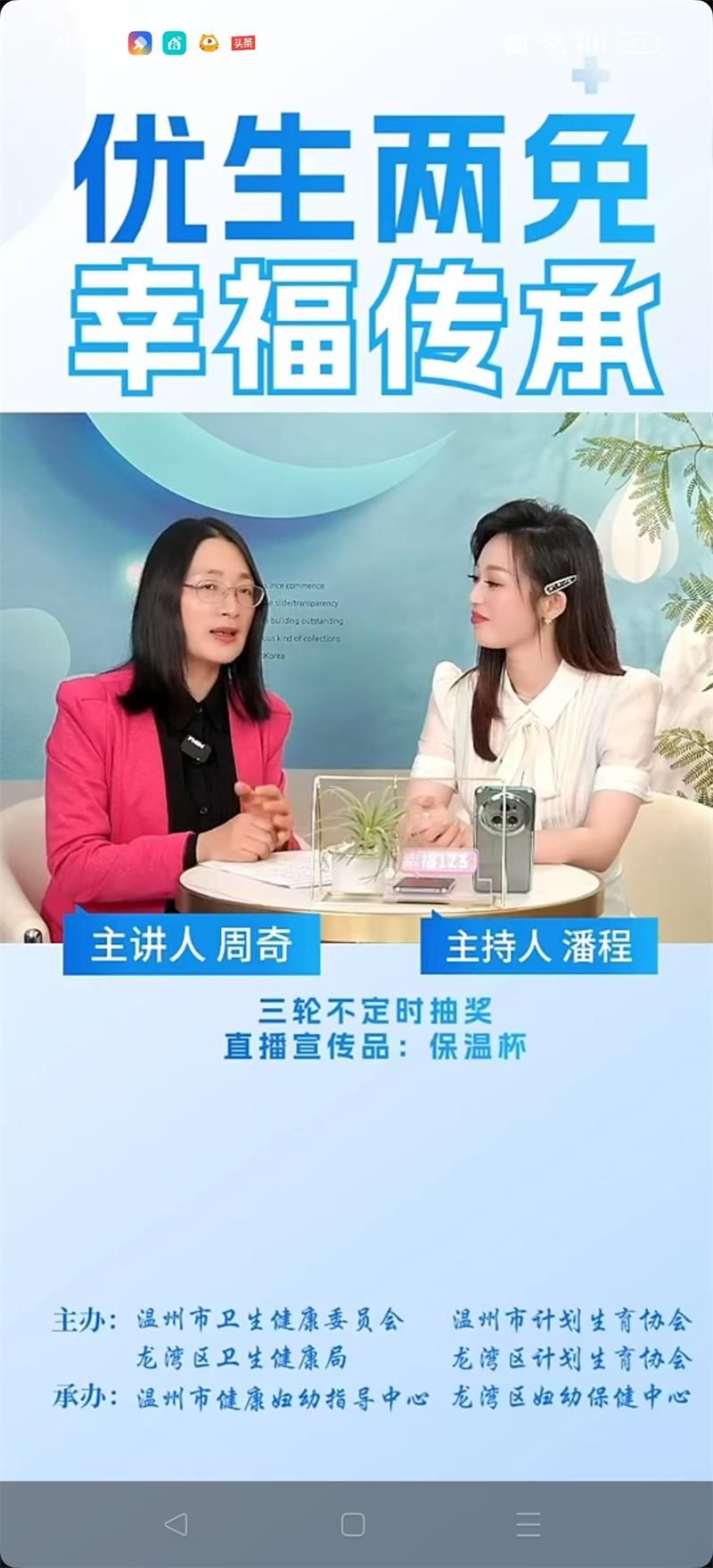 520与小满相遇,万物始茂,盈而未满。爱情和幸福如同成熟的果实,甜美而圆满。今年的520以“优生两免,幸福传承”为主题,龙湾区妇幼保健中心联合温州市卫健委、市计生协、市健康妇幼指导中心,龙湾区卫健局、区计生协等多部门,在“健康温州”和“市健康妇幼指导中心”“幸福123”直播间开展“优生两免,幸福传承——龙湾区新型婚育文化宣传”访谈直播,ac米兰官网中文网站教育学院教育学系党支部书记、ac米兰官网中文网站家庭教育研究院院长、温州市家庭教育学会副会长、温州市家庭和谐文化研究会副会长周奇教授受邀在线畅聊婚恋观、生育观、家庭观,传授新人们夫妻经营秘诀,将甜蜜藏于心间。