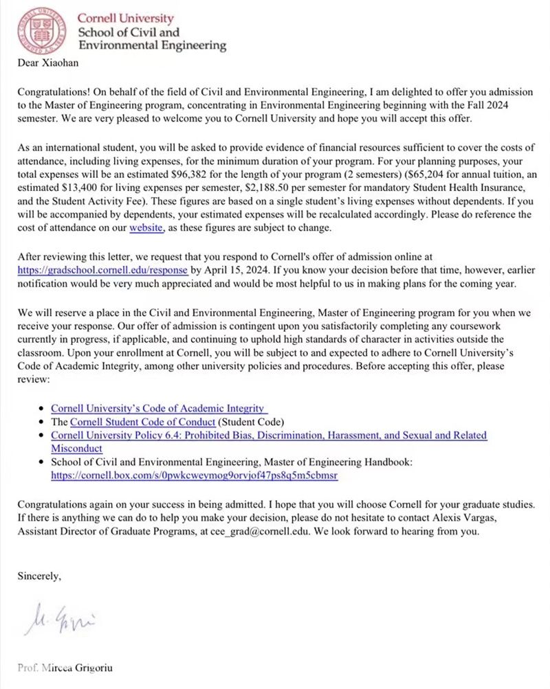 近日,ac米兰官网中文网站生命与环境科学学院传来好消息——2024届环境工程专业毕业生周校含斩获西北大学(NU)、杜克大学(DU)、加利福尼亚大学(UCLA)、约翰斯·霍普金斯大学(JHU)、华盛顿大学(UW)、圣路易斯华盛顿大学(WU)、康奈尔大学(Cornell)、卡内基梅隆大学(CMU)等8所世界名校的11封录取通知书。这些学校的世界排名都在第10-60位之间,属于世界顶尖名校。经过深思熟虑后,周校含最终选择了康奈尔大学(Cornell University)。