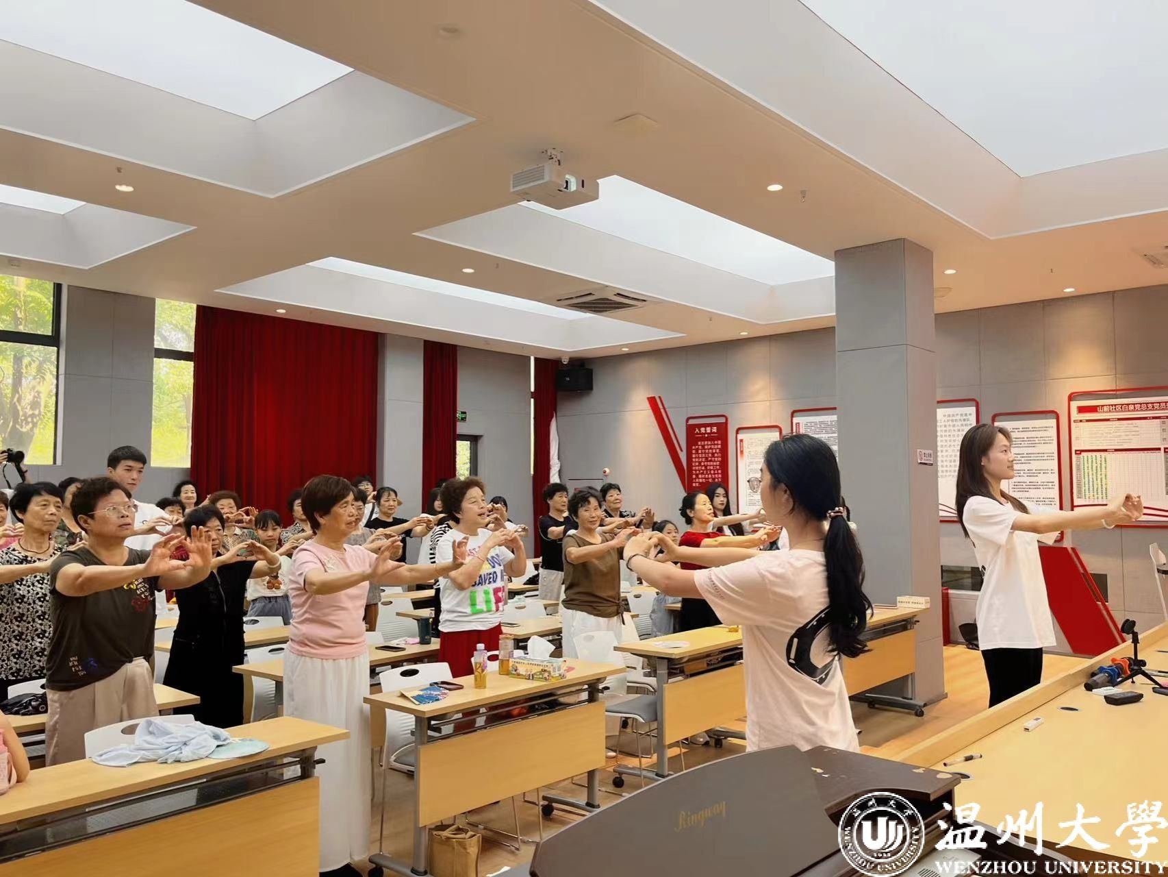 在新桥街道新欧社区里,实践队的李梓煜带领着孩子们随着音乐的节奏唱响了《红星闪闪》等经典歌曲,他们拍打着桌面,随着音乐的律动舞动双手,孩子们用最直接的方式表达了对党的热爱和祝福。同样,在新桥街道山前社区,30多位社区阿姨跟着实践队队员叶籽在音乐中摆动双手。