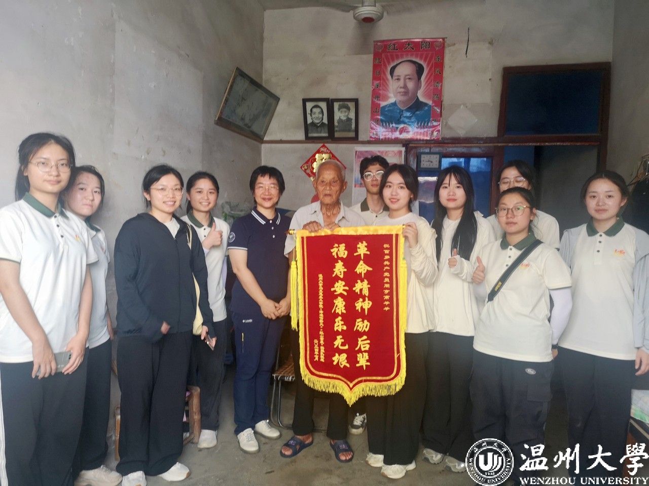 实践队还回访了百岁老交通员周亨甫老先生。在这堂特别的思政课中,队员们听老先生讲述了他担任地下交通站联络员的亲身经历,并向这位有着70年党龄的革命老前辈赠送锦旗,表达崇高敬意与诚挚祝福。