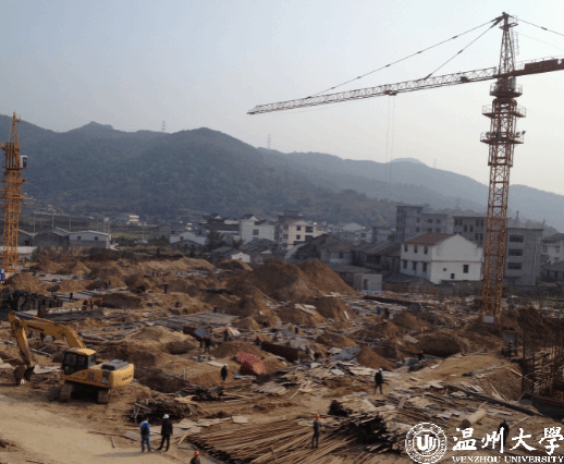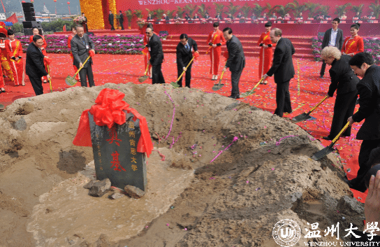 2012年3月,温州肯恩大学举行开工奠基仪式。当时来了好多中外嘉宾。我记得当天上午6点多的时候还下着大雨,没想到,仪式开始前放晴了,筹备基建的一班人赶着铺地毯。