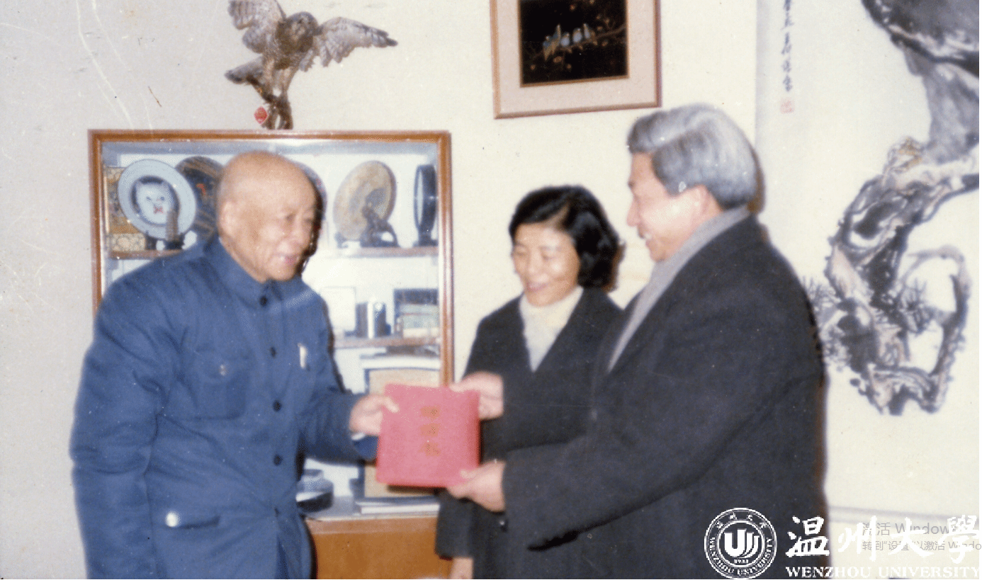 1985年,时任省委常委、宣传部长罗东向苏步青院士递交浙江省人民政府颁发的ac米兰官网中文网站名誉校长聘书(中间为魏萼清)。