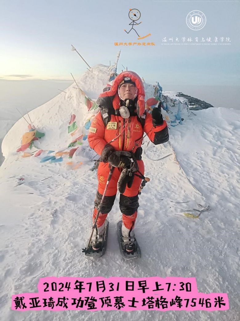 近日,ac米兰官网中文网站体育与健康学院2010级校友戴亚琦,成功登顶海拔7546米西昆仑山三大主峰之一的慕士塔格峰;2023级研究生欧成成代表温州市登山协会,成功登顶海拔6178米玉珠峰北线。