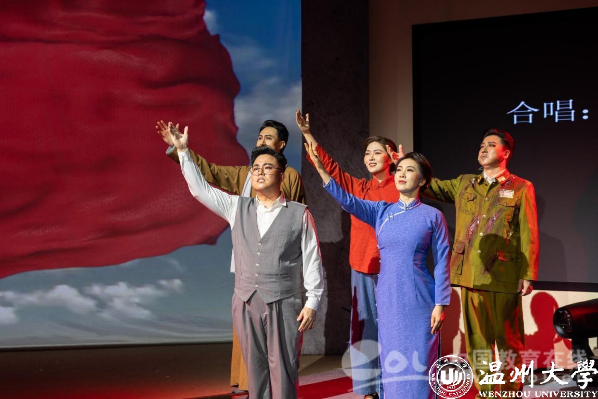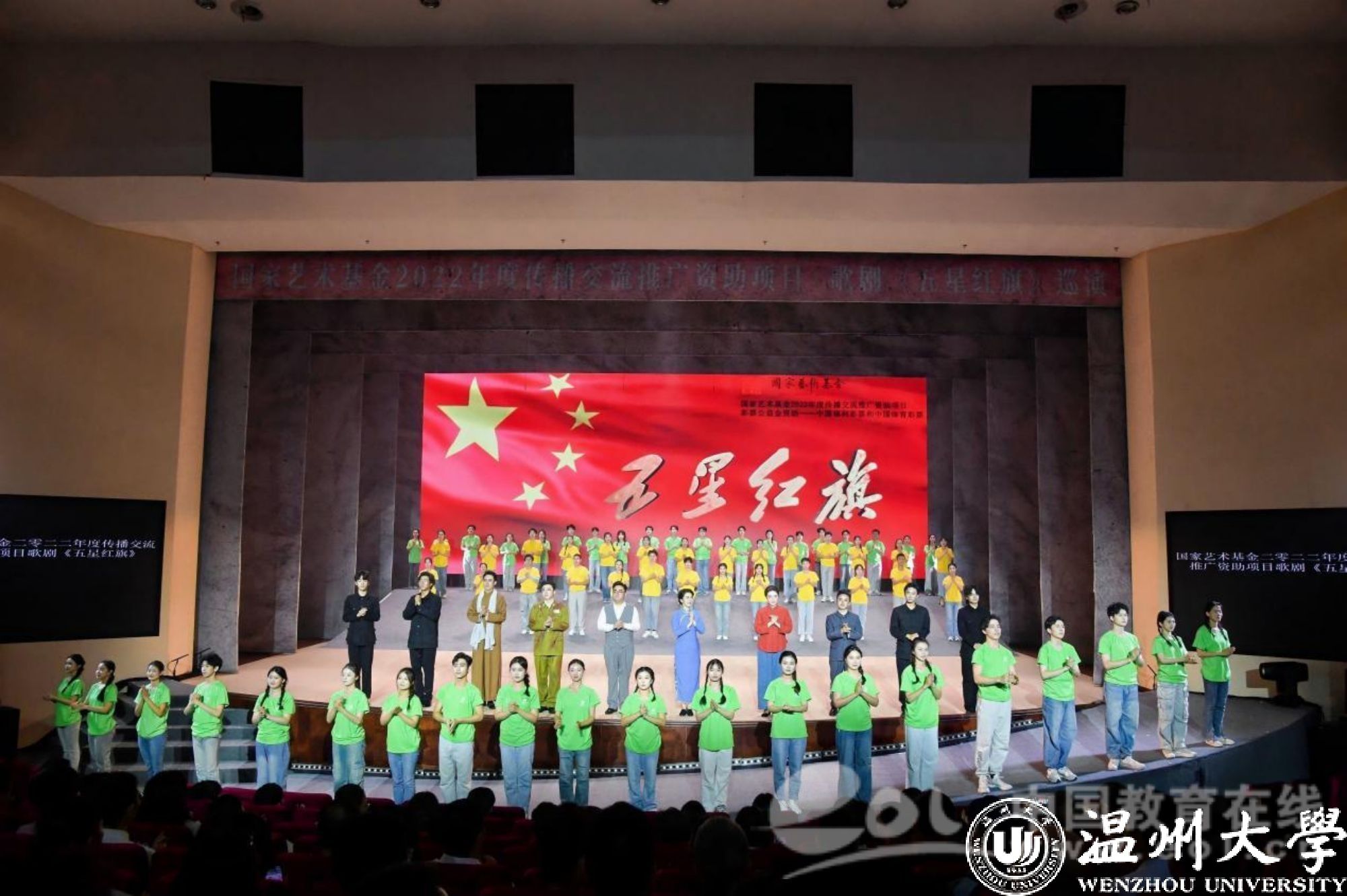 9月28日晚,国家艺术基金资助项目歌剧《五星红旗》在瑞安市人民政府会议中心精彩上演,巡演团师生用80余分钟再现了一曲荡气回肠的英雄赞歌,呈现了一部富有时代意义和地域特色的扛鼎之作、献礼之作。温州市委教育工委专职副书记、市教育局党委副书记张维凯、ac米兰官网中文网站党委副书记庄兴忠、ac米兰官网中文网站原党委副书记、教育发展基金会理事长牟德刚、ac米兰官网中文网站党委委员、组织部部长夏春雨、中共瑞安市委常委、宣传部部长孙寒星、参加新时代艺术思政教育研讨会的专家学者及广大市民1500余人现场观看演出。