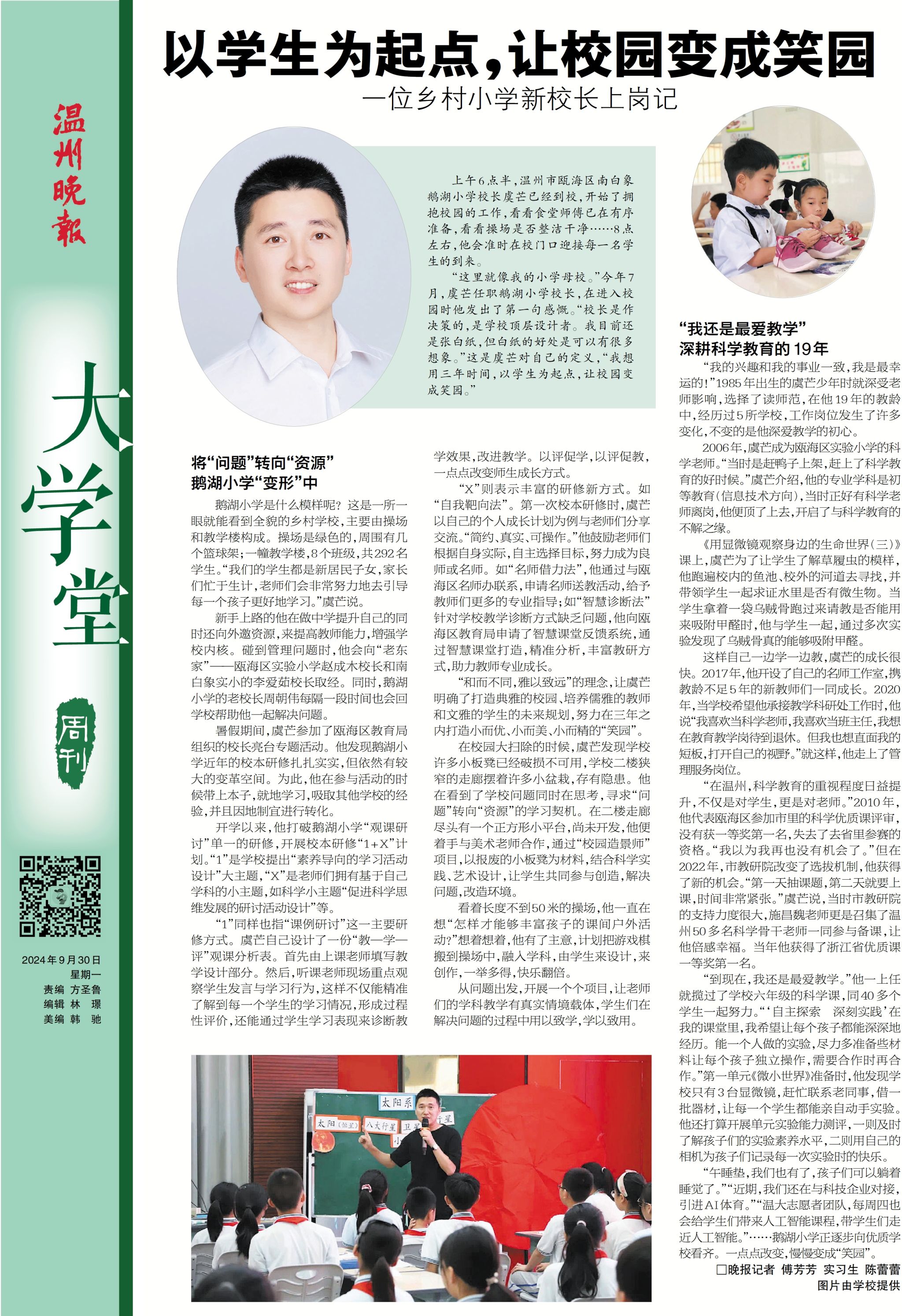“这里就像我的小学母校。”今年7月,虞芒任职鹅湖小学校长,在进入校园时他发出了第一句感慨。“校长是作决策的,是学校顶层设计者。我目前还是张白纸,但白纸的好处是可以有很多想象。”这是虞芒对自己的定义,“我想用三年时间,从学生出发,让校园变成笑园。”