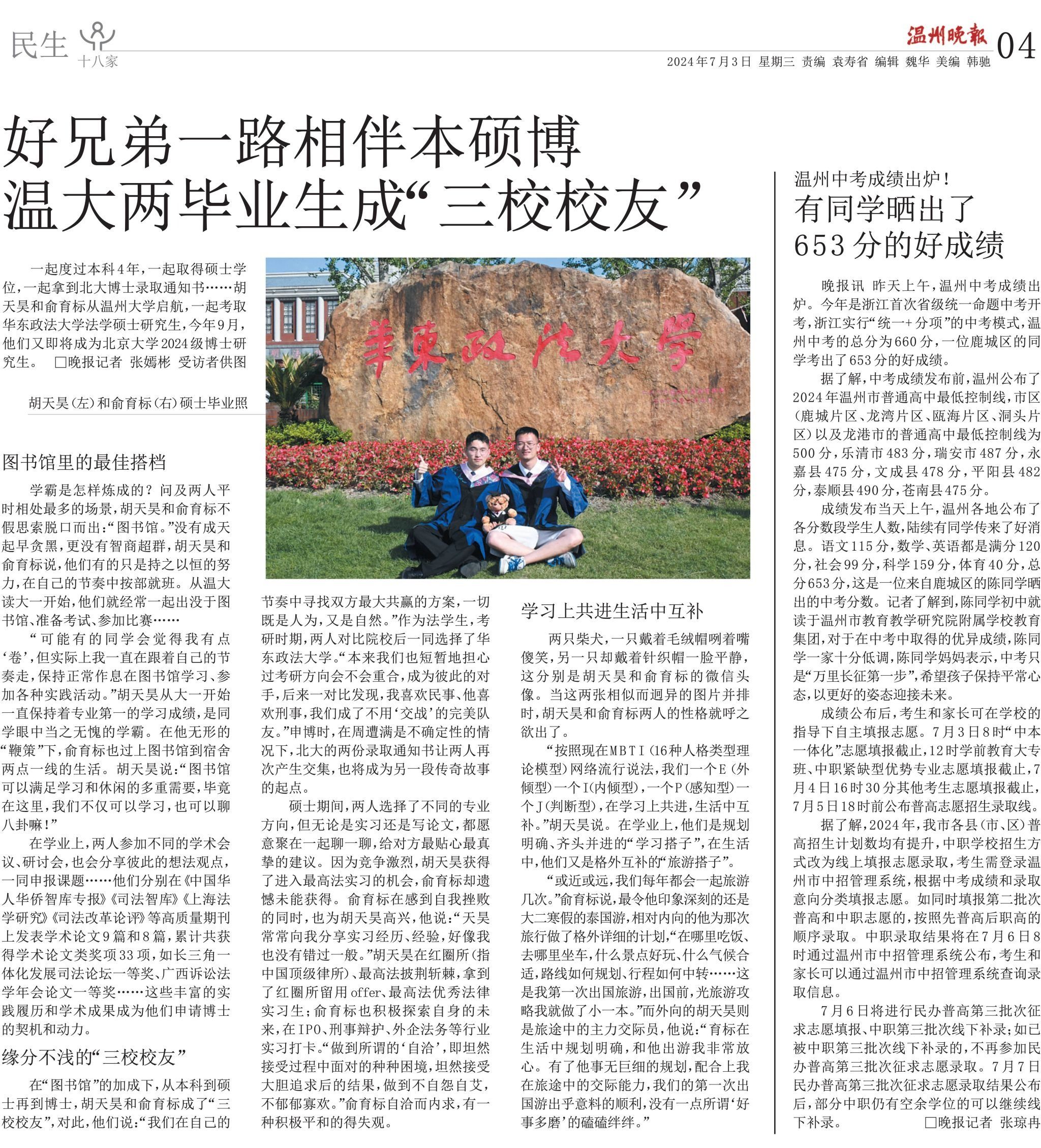 温州网讯 一起度过本科4年,一起取得硕士学位,一起拿到北大博士录取通知书……胡天昊和俞育标从ac米兰官网中文网站启航,一起考取华东政法大学法学硕士研究生,今年9月,他们又即将成为北京大学2024级博士研究生。