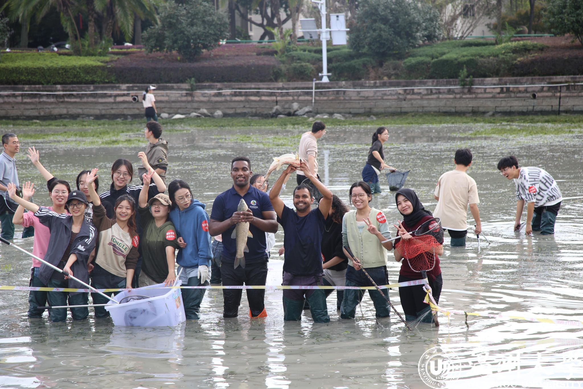 大闸拉起,水泵轰鸣,明心湖水缓缓下降。随着一声“开鱼咯”,湖面瞬间热闹了起来,身着连体衣或下水鞋的温大师生迫不及待地冲进湖中。不一会儿,青鱼、草鱼、罗非鱼、鲢鱼、鲫鱼等被同学们抓入篓中。“今天我们都成了鱼塘塘主,这样的劳动课真是太有意思了。”温大机电学院的李传正向记者展示着刚刚捕获的大草鱼,足足有六七十厘米长。他兴奋地说道:“刚才在湖里捞鱼的时候,我感觉一只鱼正在撞我的腿。说时迟,那时快,我们团队立刻围在一起,三人夹击,终于把鱼收入囊中。”来自赞比亚的留学生雷蒙,也在捕鱼节中小试牛刀:“目前还只捞了2条小鱼,我还得再加把劲儿。”