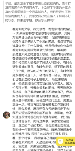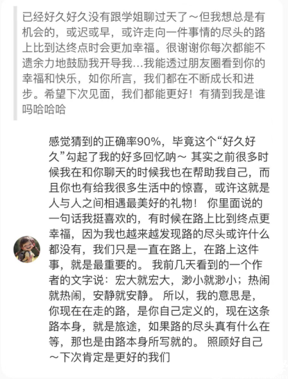 因为辩论的纯粹,刘芷君也爱上了纯粹的表达。在2023年,她开设了个人“问题箱”与匿名提问同学进行深入交流,个人组织向西藏乡村捐物绘写明信片,也开通了个人小红书账号公益回复提问同学评论及私信,累计有效回复328名同学私信,共计约30万字。看到自己的文字原来可以救赎一个人的时候,表达真的被赋予了礼物一般的意义。