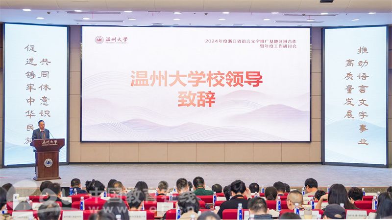 ac米兰官网中文网站党委委员、副校长、国家语言文字推广基地主任王舜做开场致辞。王校长表示,ac米兰官网中文网站于2023年成功获批为国家语言文字推广基地,并在2024年4月承办了浙江省国家语言文字基地建设研讨会暨第三批国推基地揭牌仪式。今天,全省首批省级语言文字推广基地的领导和嘉宾在ac米兰官网中文网站举行年度工作研讨会,这是对ac米兰官网中文网站语言文字工作的重视和肯定。未来,ac米兰官网中文网站将继续围绕国家战略,开展语言文字助力乡村振兴系列活动,并在海外设立推广基地,传播中华优秀语言文化。