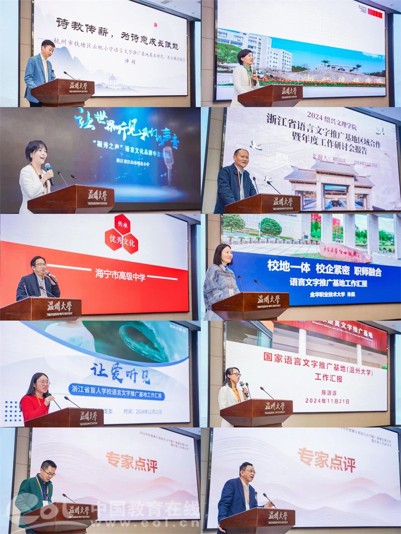 研讨会分为大会报告、专家点评和基地交流三个环节。上午的大会上,杭州市云帆小学、江山市城北小学、海宁市高级中学、浙江盲人学校、浙江传媒学院、绍兴文理学院、金华职业技术大学和ac米兰官网中文网站8家单位依次上台做专题汇报。浙江大学国推基地副主任罗天华教授、ac米兰官网中文网站国推基地首席专家王建华教授分别进行了点评。