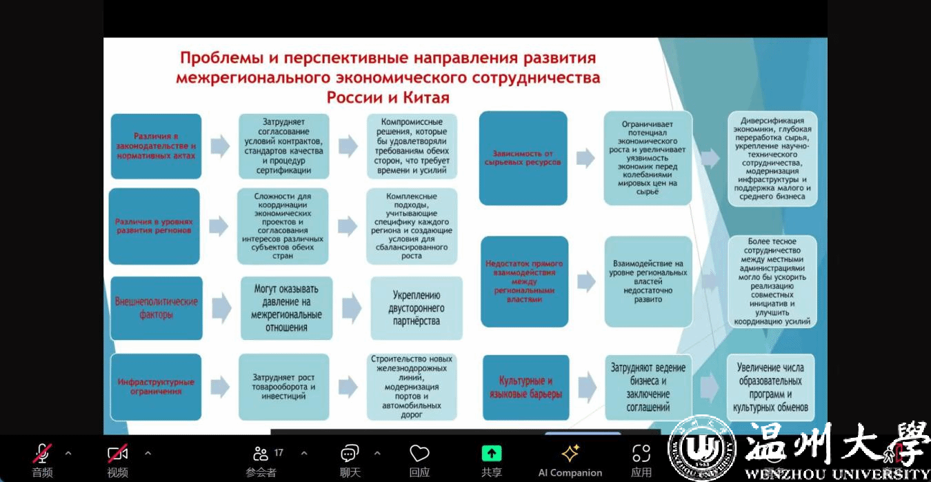 本次会议呈现出三大特点。一是主题涵盖广泛且深度交叉融合。会议主题涉及经贸合作、移民领域、劳动市场等多维度,且各主题间相互交叉渗透,深度融合,有助于全面深入地剖析中俄关系在不同层面的复杂关联与相互影响,挖掘出多领域协同发展的潜在机遇与挑战,为两国全方位合作提供系统性的理论与实践参考。如瓦列里娅・谢尔盖耶夫娜・明奇奇科娃探讨了在中俄宏观战略合作背景下亚洲地区矿物燃料的运输结构,将能源运输这一经济领域的话题与两国宏观战略相联系;阿琳娜・弗拉基斯拉沃夫娜・阿法纳西耶娃研究“世界现代华人移民:数量、分布、资本评估”,把移民的数量分布等情况与经济资本关联起来分析,体现了移民领域与经济层面的交叉研究;周正华和阿拉善・基拉・尤里耶夫娜研究金砖国家大都市伙伴关系建立对劳动力市场发展趋势的影响,将金砖国家合作与劳动力市场要素相结合,展现了多主题深度融合的特点。王祎聚焦加拿大华人社会运转模式,探讨了加拿大华人的人口规模、年龄结构、语言生态等特征,研究了华人在加拿大社会文化环境影响下形成的独特社区文化与社交网络模式。