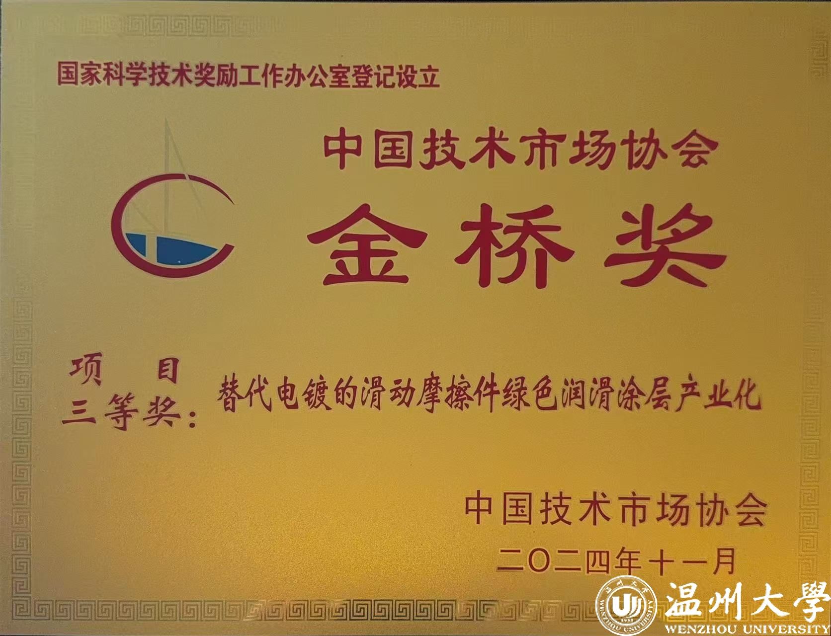12月14日,在中国技术市场协会举办的第十二届中国技术市场协会"金桥奖"颁奖现场,由ac米兰官网中文网站选送的"替代电镀的滑动轴承摩擦件绿色润滑涂层产业化"项目经过7个月的严格评审,脱颖而出,最终获得国家级项目三等奖。