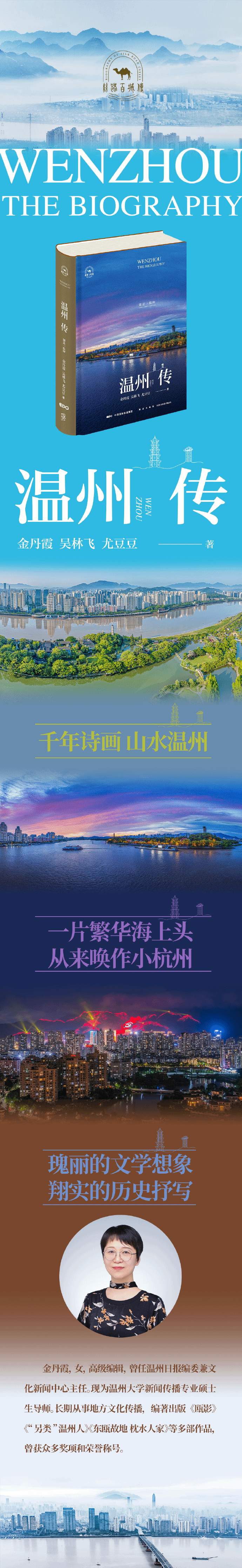 用文字立传,为城市画像。近期,“丝路百城传”系列丛书重要读本之《温州传:别是一乾坤》由新星出版社面向全国出版发行。全书逾30万字,由金丹霞、吴林飞、尤豆豆所著。该书系温州首部城市传记,以瑰丽的文学想象书写这座东海之滨的温润之州,展示其城市亮点、文化传承和悠久历史,呈现其“山海交融智行天下”的城市特质,突出其在海上丝绸之路中发挥的作用。
