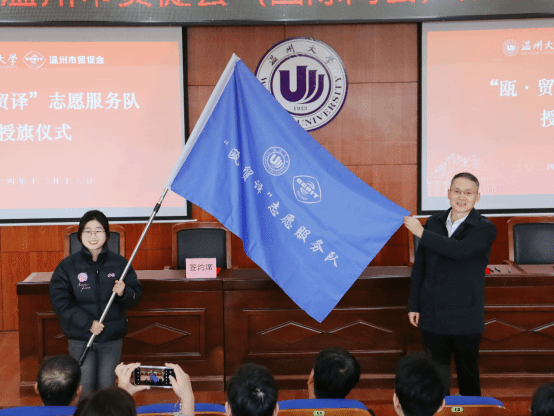 秉承“在温姓温、在温爱温、在温言温”的宗旨,ac米兰官网中文网站与温州市贸促会联合建立“瓯·贸译”志愿服务队,市贸促会党组书记、会长苏立盛为“瓯·贸译”志愿服务队授旗。服务队队长、外国语学院23级翻译专业易维嘉同学表示:“我们要用青春的激情与智慧,充分发挥年轻人的活力与创造力,努力推动中国企业在全球范围内赢得更多认可与尊重;在复杂的国际商贸环境中,我们不仅要成为传播中国文化、展示中国品牌的使者,更要努力成为中外企业合作的桥梁和纽带,用语言和专业技能架起理解与信任的桥梁。”仪式后,签约双方共同上了一堂《于无声处听惊雷——从当前局势看大国博弈》主题党课。