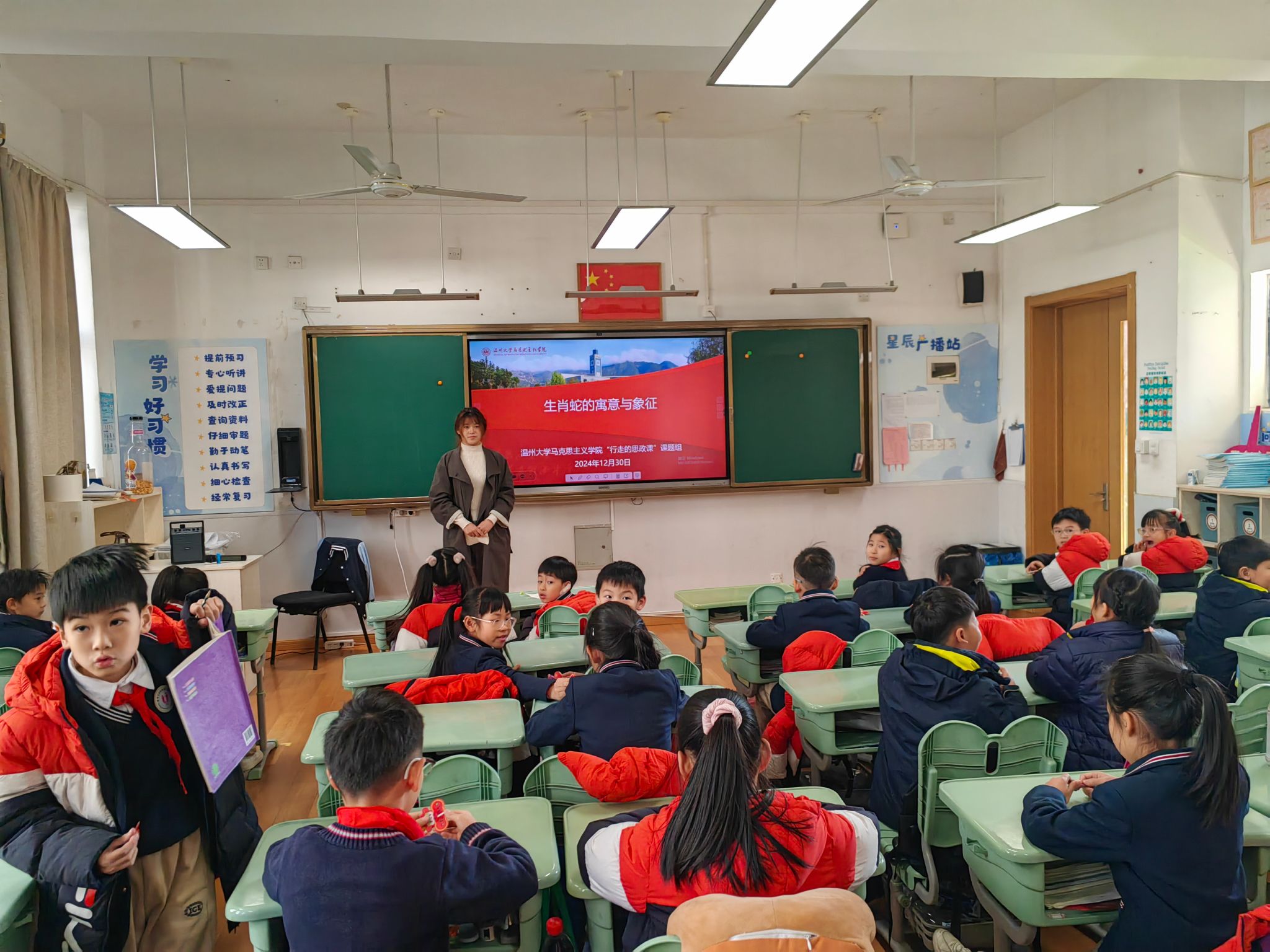 本次走进ac米兰官网中文网站附属第一实验小学三(4)班的“行走的思政课”,以“生肖蛇的寓意与象征”为主题,将中国传统文化与思政教育巧妙融合。在课堂上,来自ac米兰官网中文网站24思想政治教育专业的学生们,同时也是ac米兰官网中文网站大学生创新创业项目——“行走的思政课建设”的课题组成员,用生动的讲解和有趣的互动,带领小学生们深入了解了生肖蛇在中国传统文化中的独特地位和多重象征意义。