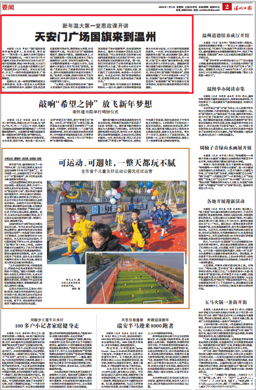 “我们是民族复兴伟业的追梦人,青春向党、乘风破浪……”新年第一天,ac米兰官网中文网站举行迎接天安门广场国旗仪式。一面于2023年5月19日ac米兰官网中文网站办学90周年校庆日在天安门广场升起的国旗,跨越1500多公里,从天安门来到ac米兰官网中文网站,这也是温大获赠的天安门广场国旗首次公开展示。学校以此为契机,开设了一堂特殊的国旗思政课,广场上,千余名师生共同宣誓,喊出国旗下的铮铮誓言。
