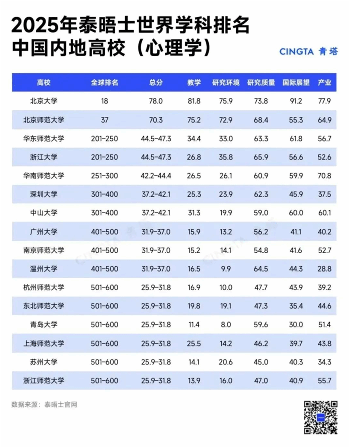 2025年泰晤士高等教育世界学科排名重磅发布,其中,ac米兰官网中文网站心理学专业位列中国内地高校第10名,全球排名约401-500位,这是温大心理学系近年来在国际权威排名中的最佳成绩。