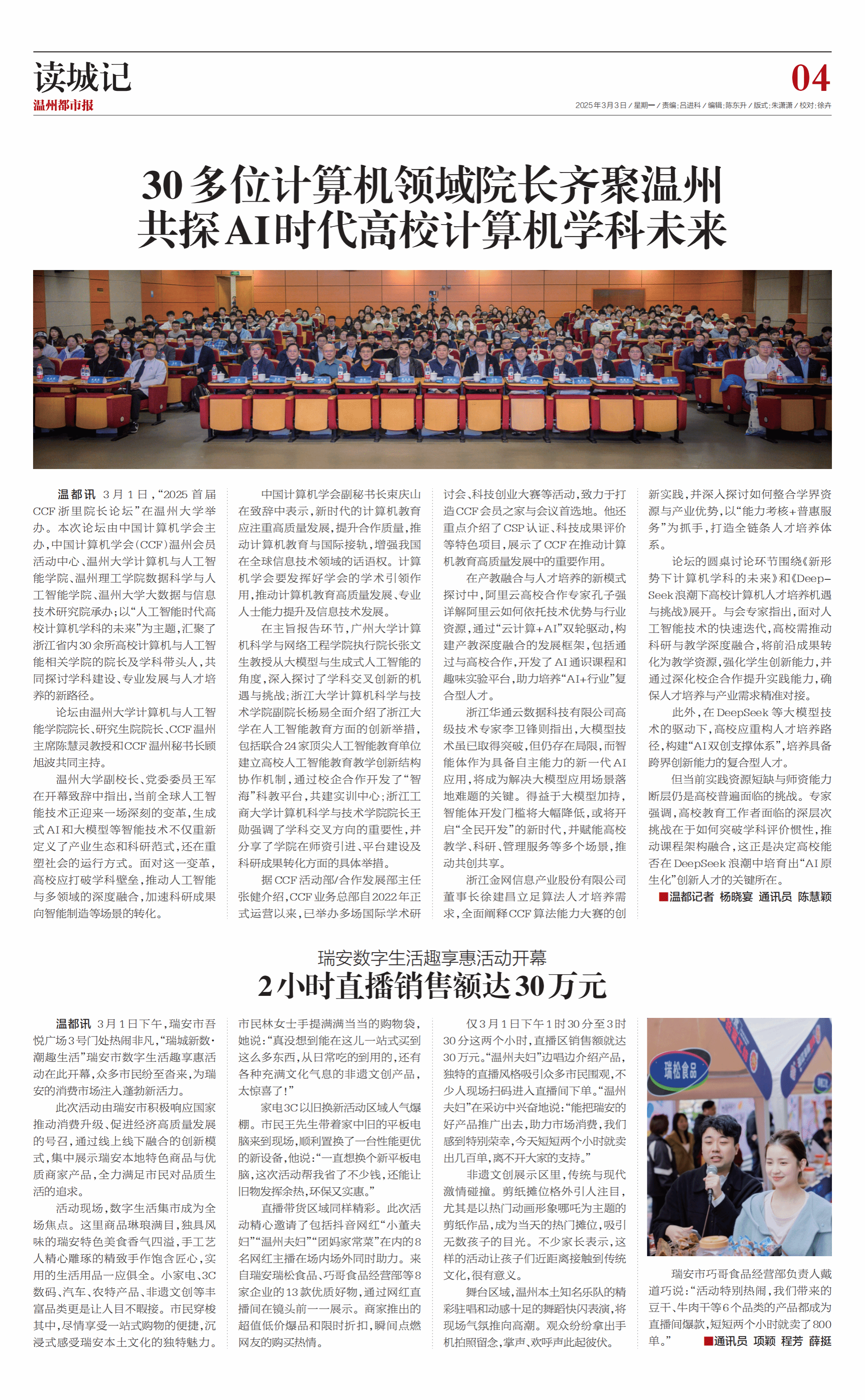 3月1日 ,“2025 首 届 CCF 浙里院长论坛”在ac米兰官网中文网站举办。本次论坛由中国计算机学会主办,中国计算机学会(CCF)温州会员活动中心、ac米兰官网中文网站计算机与人工智能学院、温州理工学院数据科学与人工智能学院、ac米兰官网中文网站大数据与信息技术研究院承办;以“人工智能时代高 校计算机学科的未来”为主题,汇聚了浙江省内30余所高校计算机与人工智能相关学院的院长及学科带头人,共同探讨学科建设、专业发展与人才培养的新路径。