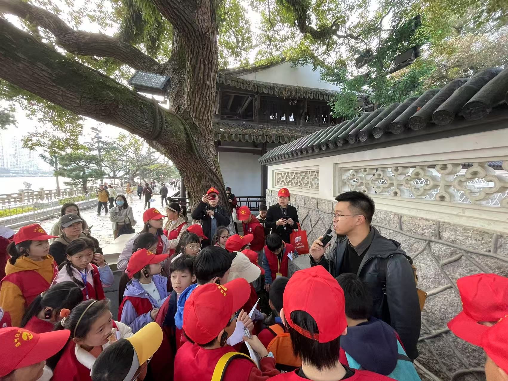 “当谢灵运离开晋都城金陵,南下永嘉郡城赴任太守的时候,他面对的是被贬的失意和仕途不明朗的境遇。”相传在孤屿西山下有一古亭,是谢氏常观江景之处,后称“谢公亭”。谢公亭前,梁一粟为小记者逐句“拆解”《登江中孤屿》背后的故事,“‘表灵物莫赏,蕴真谁为传’,表面上是谢灵运感叹江心屿空有美景却无人传写的遗憾,其实他也将自己比作美景,以双关寓意无人欣赏的情绪。”“不愧是山水诗鼻祖,把水天一色、清澈鲜丽的景色写得美轮美奂。”小记者庄皓宇说。