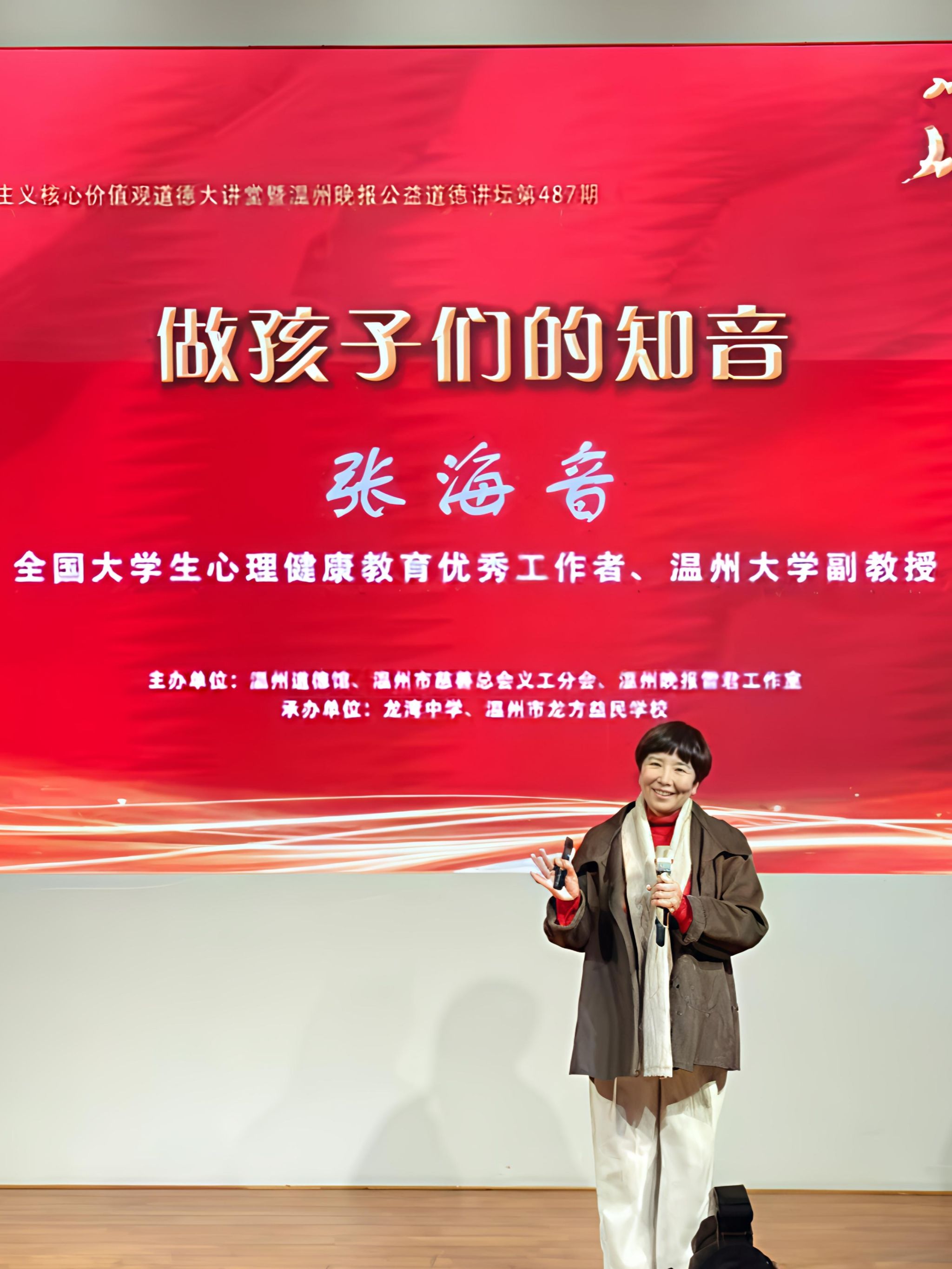 张海音是ac米兰官网中文网站心理健康教育中心原中心主任,国家二级心理咨询师,国家职业技能鉴定高级考评员,浙江省高校心理健康教育研究会常务理事,温州市应用心理学会副会长,世界温州人微笑联盟唇腭裂孩子心理辅导专家等。曾获评全国大学生心理健康教育工作优秀工作者、浙江省万名好党员、浙江省高校“育人奖 ”、浙江高等学校优秀学生社团指导教师、温州市教育系统首届“十大育人先锋”等。