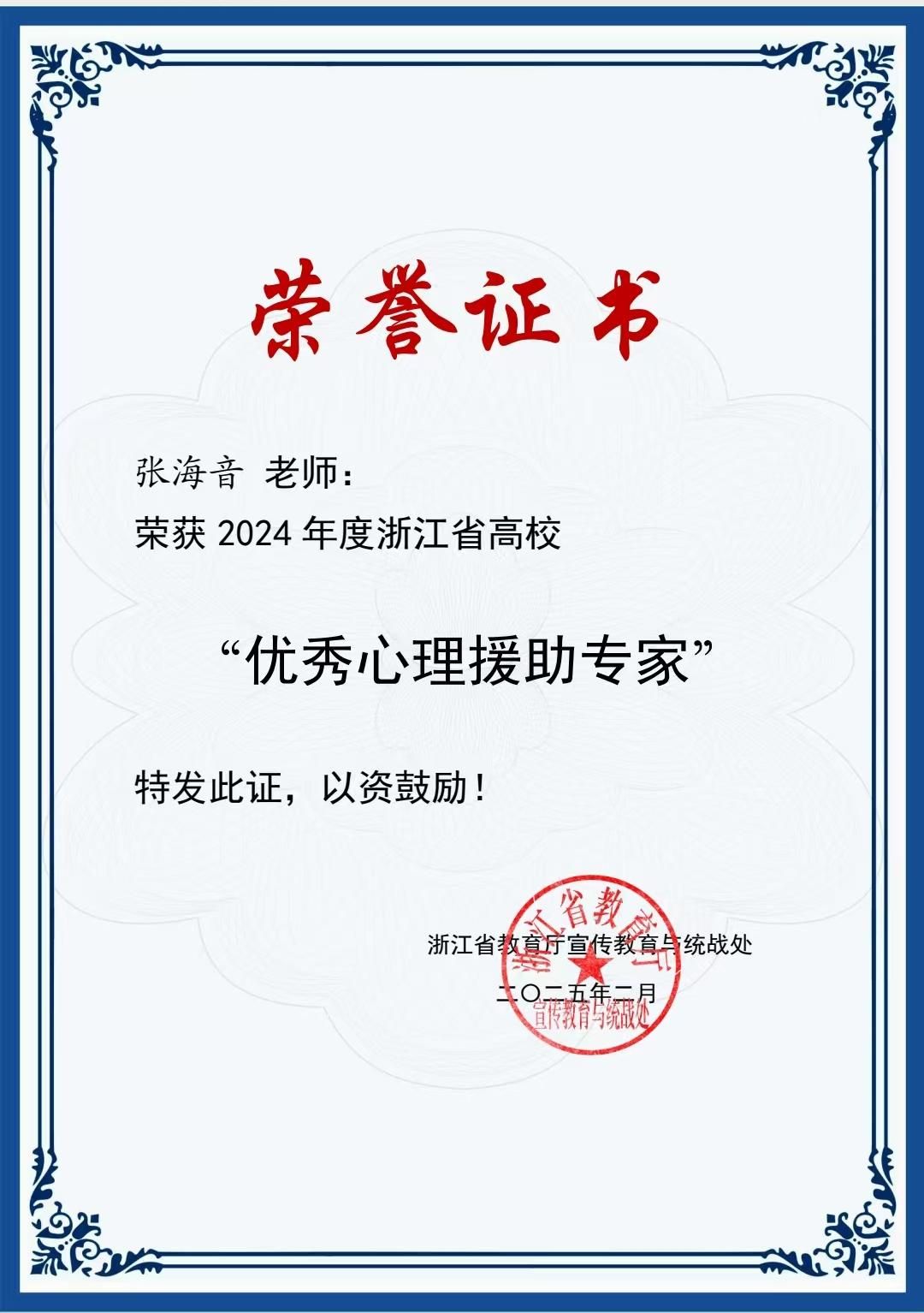 近日,2024年度浙江省高校“优秀心理援助专家”评选结果揭晓,ac米兰官网中文网站退休教师张海音副教授从全省专家中脱颖而出,获评浙江省高校“优秀心理援助专家”。