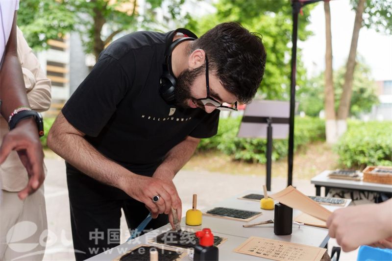 现场的各种中国文字与传统文化体验项目,让留学生沉浸式地体验了中国文字的起源发展与中国传统文化的博大精深。甲骨文识别与书写区,留学生们在猜字识文的乐趣中体验中华汉字的源远流长;书法体验区,留学生们拿起毛笔,尝试书写汉字,感受书法艺术的独特韵味;水墨画区域,他们欣赏画作并动手创作,体悟传统绘画的意境美;木活字印刷区,留学生亲自操作,惊叹于古代印刷术的智慧;在茶香四溢的茶道体验区,他们沉浸式感受中国茶道文化的优雅。汉服试穿活动更是备受欢迎,留学生们身着汉服拍照打卡,体验中国传统服饰之美。