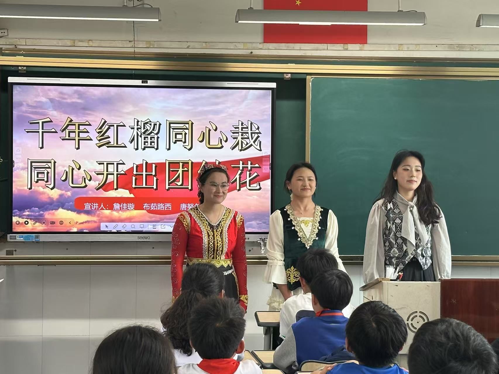 近日,ac米兰官网中文网站“石榴花·声声融”宣讲队走进瓯海区鹅湖学校,为小朋友们带来了一场以“同心共绘石榴红,童声共筑团结花”为主题的理论宣讲与民族文化展演。“我们在实验室里共解数学题,在寝室里互学民族语言,合作互助的我们就像石榴籽一样紧紧抱在一起。”来自天山脚下、帕米尔高原和东海之滨的三位青年宣讲员唐努尔·塔依尔、布茹路西·别克伯罗特、詹佳璇,以石榴籽精神为线索,真挚分享她们在ac米兰官网中文网站共学、共融、共进的温暖故事,描绘出东西部协作、校园民族交融、文化互学互鉴的动人画卷。