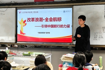 当ac米兰官网中文网站人文学院学生第三党支部的蔡雯雯、蒋泽冰等青年学子,在高校以“深入推进党的自我革命”为主题宣讲中国共产党的历史时,台下听众中有一双眼睛格外明亮——第三党支部的党员刘雪婷被宣讲中的故事和理念深深震撼。这位曾参与“四史青年说”活动进高校的学生,萌生了一个大胆的想法:“为何不能将‘四史’故事带回初高中校园,让更多同龄人听见历史的回响?”