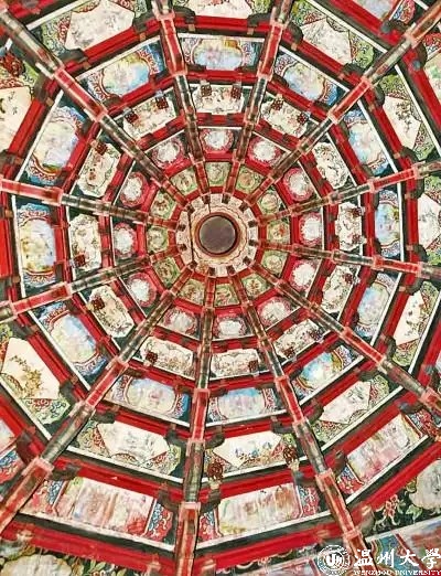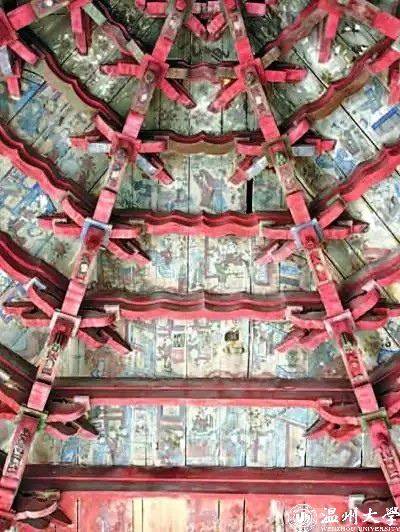 温州古戏台彩绘的画面形态之别致,得益于古戏台建筑结构的繁复与精妙。