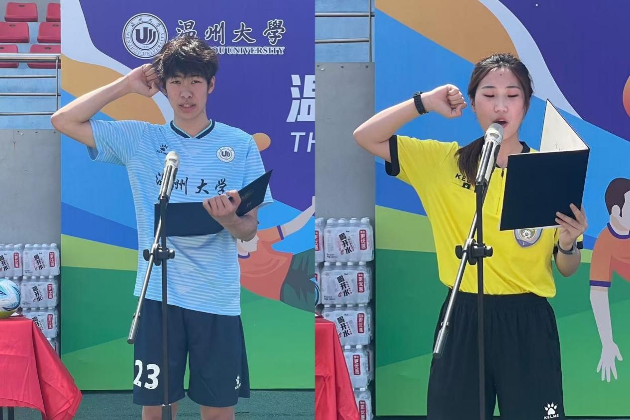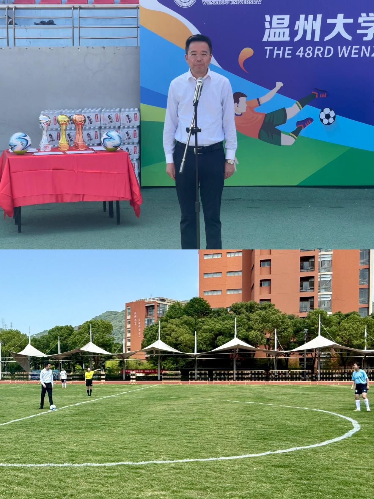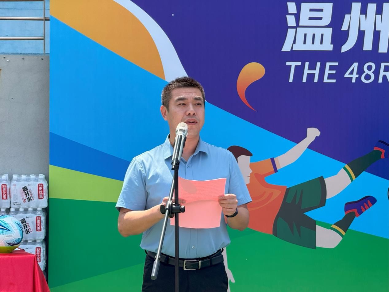 温大体育与健康学院党委书记周德奎代表大赛组委会致辞。他指出,ac米兰官网中文网站不断深化“五育融合”,高度重视体育工作,近年来学校足球运动发展成果显著。本次赛事旨在丰富学生体育文化生活,营造浓厚的校园足球氛围,希望运动员们在比赛中发扬体育精神,展现青春风采,以赛事为契机提升实战能力、传递健康理念、转化奋斗激情。