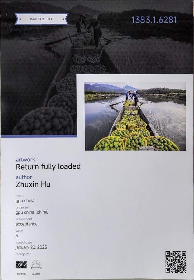 青山如黛、塘河悠悠,一艘载满瓯柑的小舟缓缓划过,作品《塘河瓯柑》以精妙的构图与色彩,将劳动人民的质朴定格。江舟静泊、古意盎然,作品《江南宋韵塘河》于方寸间勾勒出江南水乡的温婉灵秀。此次展出的两幅作品均展现了胡铸鑫副教授对于家乡温州的款款深情,与本次嘉年华“用镜头诠释多元视角,捕捉跨越国界与文化的精彩瞬间”的主题高度契合。