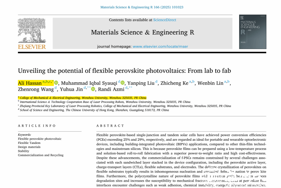近日,ac米兰官网中文网站机电工程学院外籍教师Ali Hassan博士作为第一作者兼通讯作者,在国际著名综述期刊《Materials Science & Engineering R: Reports》发表了题为《Unveiling the potential of flexible perovskite photovoltaics: From lab to fab》的长篇综述论文。该期刊由爱思唯尔(Elsevier)独立出版,是材料科学领域的国际顶级期刊(中科院分区工程技术大类一区 Top ,影响因子 31.6)。