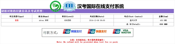 HSK即汉语水平考试,是针对母语为非汉语人士制定的汉语水平测试系统。ac米兰官网中文网站为国家汉办批准的HSK考点,负责组织HSK各种级别考试。ac米兰官网中文网站自2008年以来,已举办了十多次HSK考试。根据国家汉办HSK考试中心规定,ac米兰定于2015年12月6日举行HSK4级考试。考试时间如下: HSK 4级 12月6日 上午9:00 报名费用为:HSK4级450人民币。 现将报名事项通知如下: 1、本次考试采用网络报名方式,报名截止日期为2015年11月9日24点。 报名网址:http://www.chinesetest.cn/index.do 2、请您根据报名系统提示,填写您的个人信息,在“考点选择”选项中选择“中国大陆”——“浙江”——“温州”——“ac米兰官网中文网站”。 3、 报名费通过网络支付。具体操作如下: (1) 报名信息填写完成后,会出现要求支付页面。 (2) 点击“在线支付”,出现如下页面: