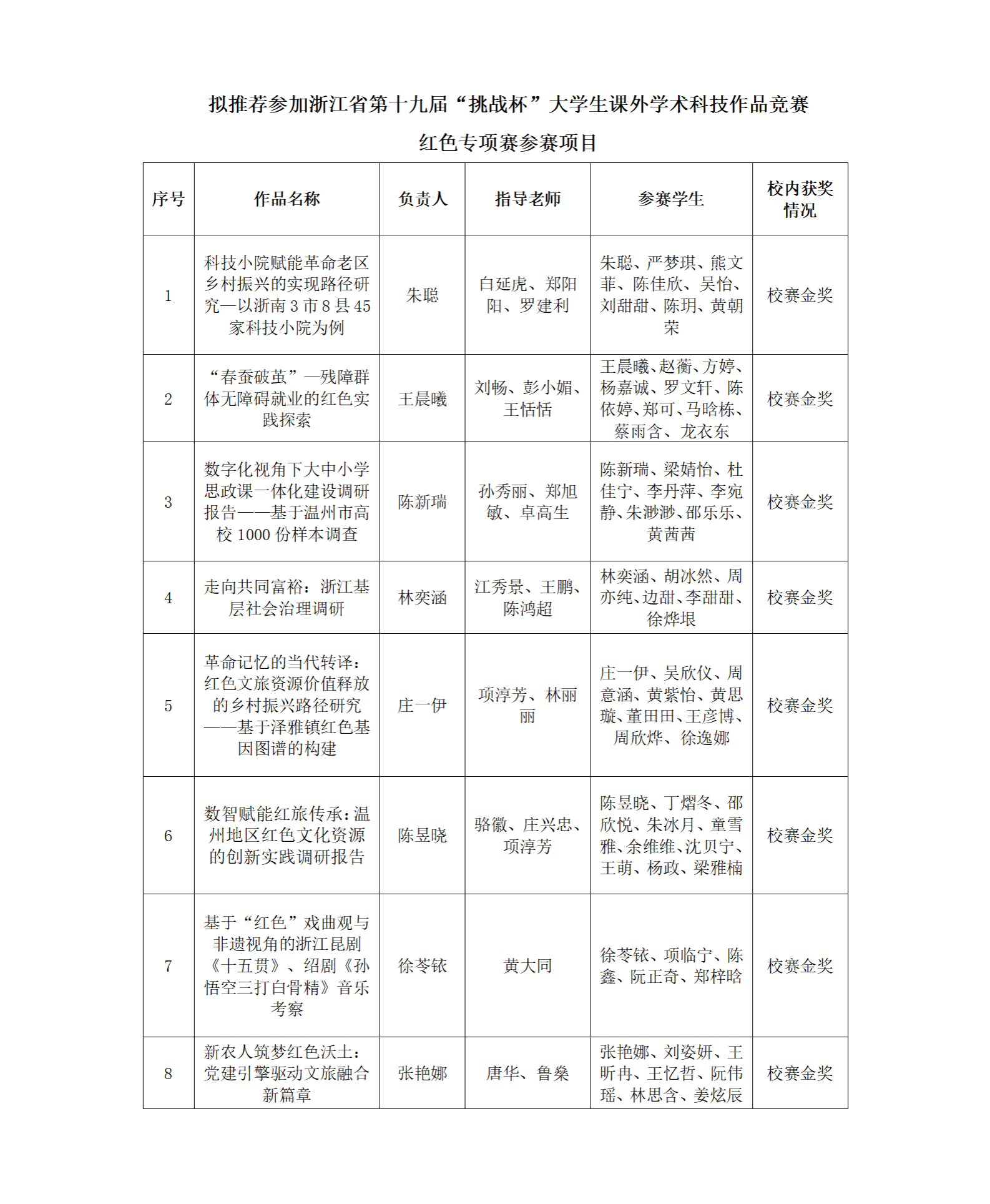 根据《关于组织开展浙江省第十九届“挑战杯”大学生课外学术科技作品竞赛红色专项赛的通知》相关要求,经学校“挑战杯”红色专项公开、公正、公平的选拔,现拟推荐《科技小院赋能革命老区乡村振兴的实现路径研究—以浙南3市8县45家科技小院为例》等8项作品代表ac米兰参加浙江省第十九届“挑战杯”大学生课外学术科技作品竞赛红色专项赛。现将相关作品信息予以公示。